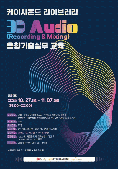 À̹ø ¡®ÄÉÀÌ»ç¿îµå ¶óÀ̺귯¸® 3D Audio(Recording & Mixing) À½Çâ±â¼ú±³À°¡¯Àº È¿°úÀ½¿ø Á¦ÀÛ¿¡ ÇÊ¿äÇÑ Àü¹® ±â¼ú °úÁ¤À¸·Î, Çѱ¹Çü ¿µÈ È¿°úÀ½¿ø Á¦ÀÛ¿¡ ÇÊ¿äÇÑ Àü À½Çâ±â¼ú±³À°ÀÌ Àü¾× ¹«·á·Î Á¦°øµÈ´Ù.