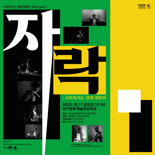 [HKSÇàÁ¤¹æ¼Û]ÀüºÏ ¿ÏÁÖ±º¿¡ ±í¾î°¡´Â °¡À»¹ã, »ç¶óÁ®°¡´Â Åä¼Ó ¹Î¿äÀÇ ¼û°áÀ» Çö´ëÀûÀÎ °¨°¢À¸·Î ÀçÁ¶¸íÇϰí ÀçÇØ¼®ÇÑ Æ¯º°ÇÑ ±¹¾Ç °ø¿¬ÀÌ ÆîÃÄÁø´Ù. ¿ÏÁÖ¹®ÈÀç´ÜÀº ¿À´Â 10¿ù 17ÀÏ, ¿ÏÁÖÇâÅ俹¼ú¹®Èȸ°ü¿¡¼ ±¹¾Ç¾Ó»óºí ºÒ¼¼ÃâÀÇ 'ÀÚ¶ô: »ç¶óÁ®°¡´Â °Í¿¡ ´ëÇÏ¿©' °ø¿¬À» °³ÃÖÇÑ´Ù