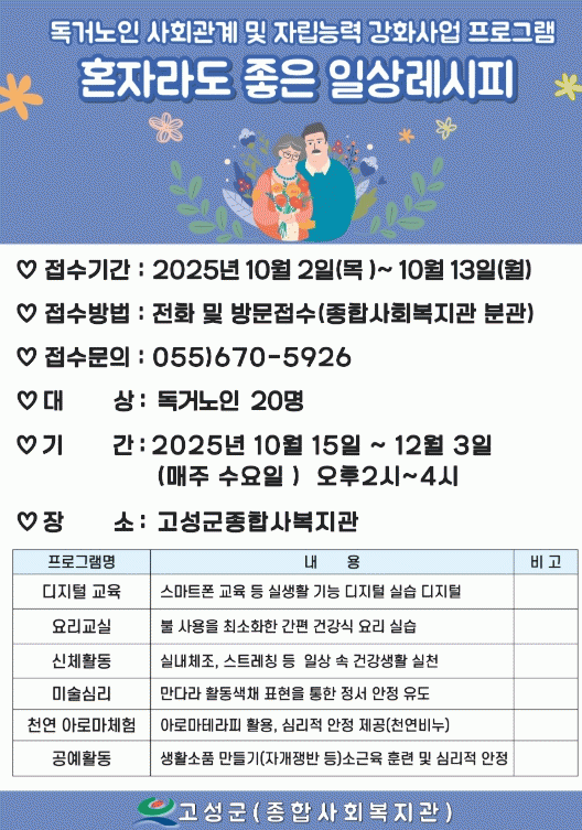 [HKSÇàÁ¤¹æ¼Û]°í¼º±ºÀº 10¿ù 2ÀϺÎÅÍ 13ÀϱîÁö °í¼º±ºÁ¾ÇÕ»çȸº¹Áö°ü¿¡¼ µ¶°Å³ëÀÎ ¾î¸£½ÅÀ» ´ë»óÀ¸·Î µ¶°Å³ëÀÎ ÀÚ¸³ ¹× »çȸ°ü°è Çü¼º ÇÁ·Î±×·¥ ¡®È¥ÀÚ¶óµµ ÁÁÀº Àϻ󷹽ÃÇÇ¡¯ Âü¿©ÀÚ¸¦ ¸ðÁýÇÑ´Ù.