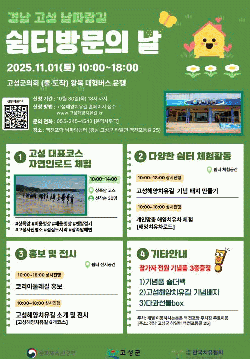 [HKSÇàÁ¤¹æ¼Û]°í¼º±ºÀº 11¿ù 1ÀÏ ¿ÀÀü 10½ÃºÎÅÍ ¿ÀÈÄ 6½Ã±îÁö, °í¼º ÇÏÀϸ鿡 À§Ä¡ÇÑ ¸ÆÀüÆ÷Ç× ³²ÆÄ¶û½°ÅÍ ÀÏ¿ø¿¡¼ '°æ³² °í¼º ³²ÆÄ¶û±æ ½°ÅÍ ¹æ¹®ÀÇ ³¯'Çà»ç¸¦ °³ÃÖÇÑ´Ù.